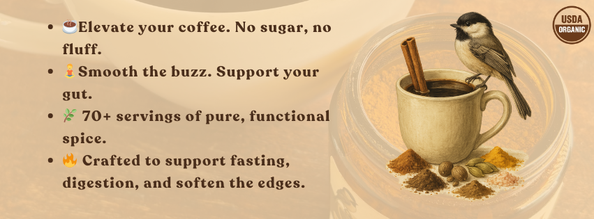 There’s zero sugar, zero sweeteners, and no calories to spike insulin. Just real organic spices that support digestion, blood sugar, and mental clarity—perfect for your fasting window.